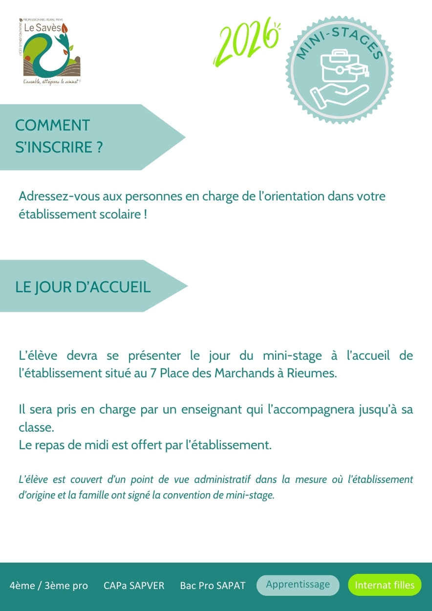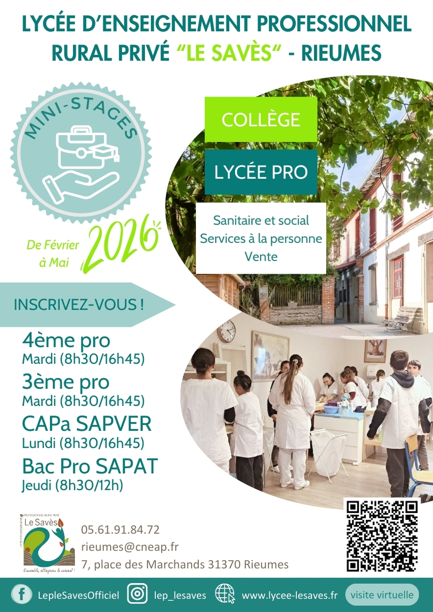 - Lycée d’Enseignement Professionnel Rural Privé « Le Savès » de Rieumes propose des JOURNÉES D’IMMERSION ou MINI-STAGES pour chacune de ses formations dans le domaine du sanitaire et social, les services à la personne et la vente : 4ème et 3ème professionnelles - CAPa SAPVER - Services Aux Personnes et Vente en Espace Rural - Bac professionnel SAPAT - Services aux Personnes et Animation dans les Territoires (formation par apprentissage ouverte dès la classe de 1ère) (affiches1 et 2 )